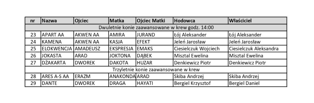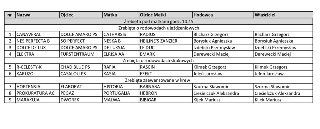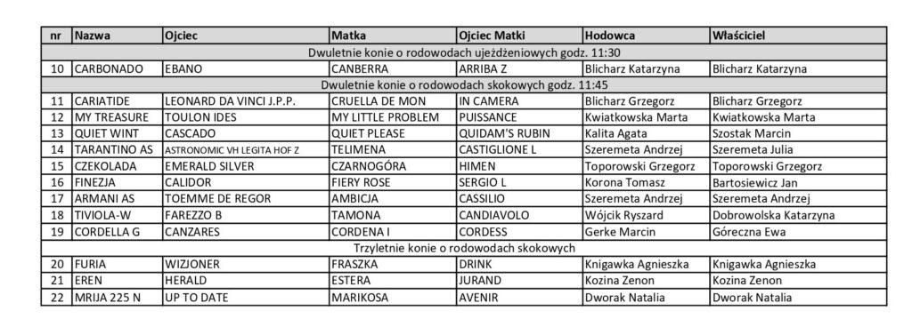 Lista koni – Dni Polskich Koni Sportowych, Lipina Nowa 24.10.2025