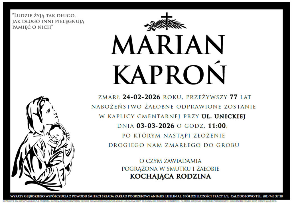 Ze smutkiem informujemy o śmierci prof.dr hab. Mariana Kapronia, wieloletniego pracownika Katedry Hodowli i Użytkowania Koni na Wydziale Nauk o Zwierzętach i Biogospodarki, UP w Lublinie.